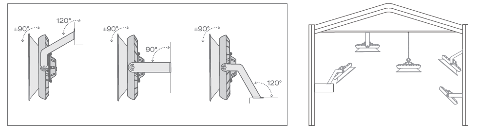 | قابلیت نصب چراغ در دو مدل آویز و نصب سطحی(پایه نصب ساده و پایه نصب زاویه دار) می باشد. |