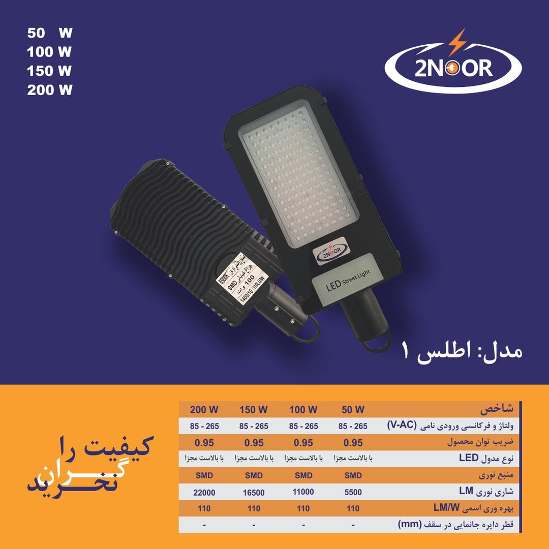چراغ خیابانی 50/200 وات دونور مدل اطلس 1 دارای طراحی زیبا و منحصر به فردی است که به سیستم دفع حرارت مجهز شده است. چراغ خیابانی دونور مدل اطلس 1 دارای بازده نوری و طول عمر بالایی می باشد که در راستای کاهش هزینه های انرژی کمک شایانی می کند. از ویژگی های مثبت این چراغ خیابانی اس ام دی می توان به تامین پخش نور کاملاً یکنواخت اشاره کرد. این محصول با بهره بری 100 لومن بر وات را می تواند تولید نماید. چراغ خیابانی (Street Light) دونور دارای منبع تغذیه استانداردی است که در برابر ولتاژ اضافی و گذرا از حفاظت کرده و به قابلیت های بسیاری نظیر ضریب توان بالا، آلودگی هارمونیکی کم و کنترل دقیق جریان مجهز می باشد.