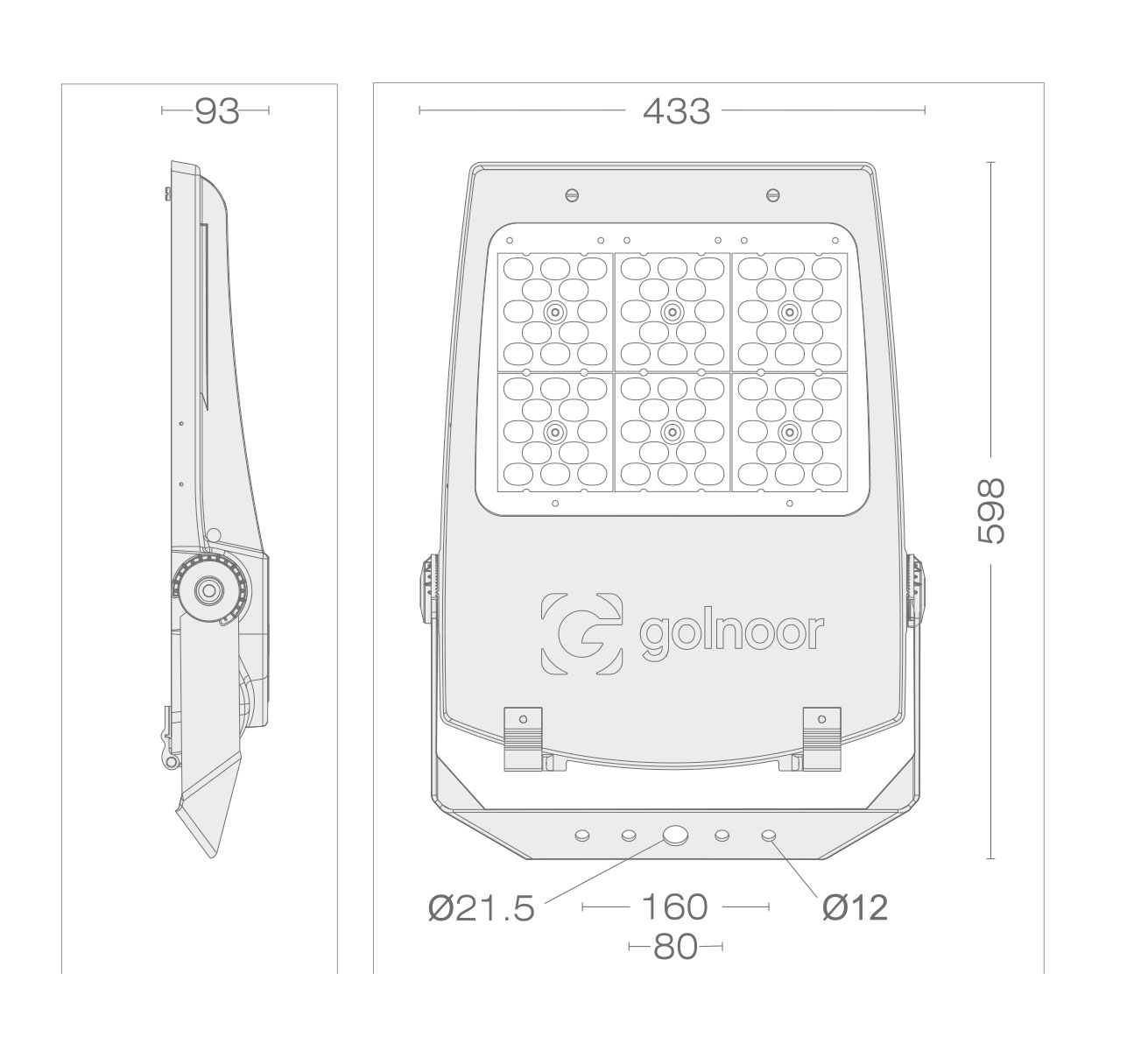 نورافکن 260/300 وات گلنور LED IP65 مدل آریل 4 یک نورافکن ساخت شرکت گلنور است که دارای آب بندی و درجه حفاظت IP66 می باشد. ساختار بدنه این پروژکتور گلنور از جنس آلومینیوم دایکاست می باشد و مدل آریل 4 آن دارای طراحی زیبا و منحصر به فردی است. پروژکتور SMD گلنور پخش نور بسیار متقارنی دارد. طراحی این پروژکتور(نورافکن) گلنور به شکلی است که حرارت ایجاد شده از لامپ را به خارج از پروژکتور انتقال می دهد. شرکت گلنور در هر بخش این پروژکتور، از نوارهای آب بندی از جنس سیلیکونی استفاده کرده است که همین امر سبب شده است که آب بندی استانداردی برای این نورافکن به وجود بیاید. شیشه به کار رفته شده برای این پروژکتور از جنس سکوریت و تخت می باشد که بازتاب نور مطلوبی نیز دارد. رنگ بدنه نورافکن گلنور پودری الکتروستاتیکی است که بسیار با دوام می باشد. این محصول دارای قابلیت تنظیم دقیق و آسان زاویه است در نتیجه به راحتی می توان زاویه تابش نور آن را به صورت دل خواه تنظیم کرد. این محصول مجهز به گلند PG13.5 می باشد.